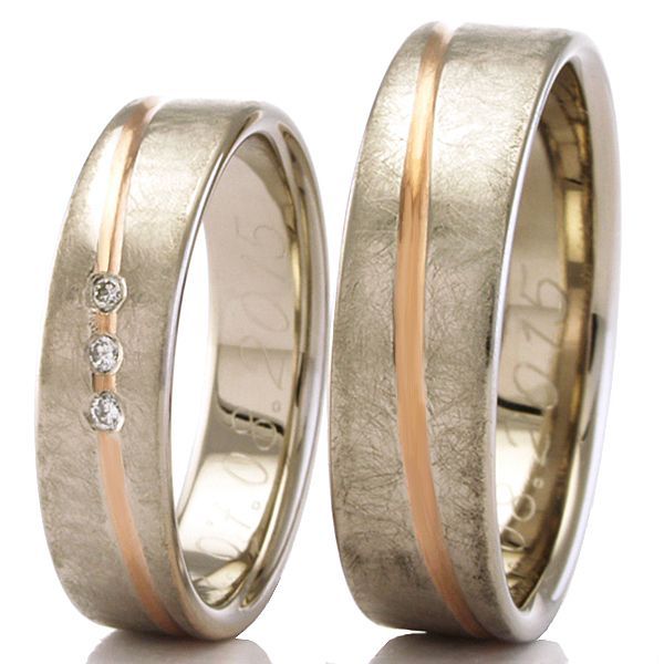 Trauringe in 585/- Graugold, Fuge rot vergoldet, eismatt, 3 Brillanten ges. 0,030 ct. Tw/Si